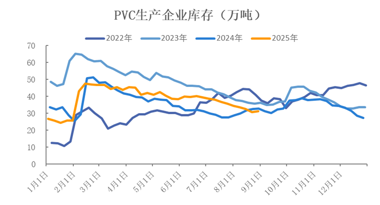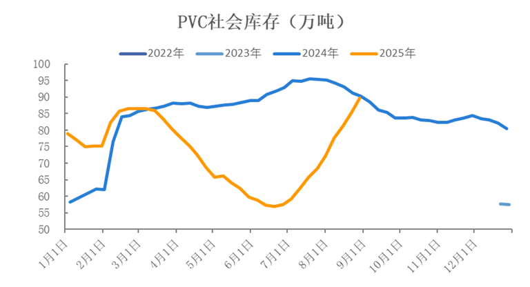 8月PVC市场仍处于供强于需的局面。供应端,中上旬受前期停车的中泰、中盐内蒙古等装置重启影响,产能利用陡峭上升,至8月15日开工率当周值达到80.33%高位;中下旬华谊、镇洋、新中贾、君正、中泰等企业新增检修装置,产能利用率高位回落,至8月29日开工率当周值在76.02%。总体上,8月PVC行业开工率平均值高于7月水平。需求端,下游正处淡季,高温、降雨天气限制地产、基建项目动工,且国内需求持续受房地产市场拖累。8月PVC下游开工率在41%至42%偏低水平波动,均值较7月环比下降。出口方面,受中旬印度反倾销税超预期上调,叠加亚洲9月合同价格低于预期影响,出口市场观望为主,对缓解国内供需矛盾作用有限。由于供应增加、需求持续疲软,8月PVC总库存积累明显,目前已接近2024年同期的高位水平。分构成来看,8月PVC生产企业预售增加,库存向下转移顺利,工厂库存延续去化趋势,社会库存出现大幅增长。