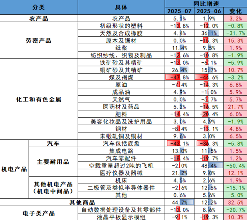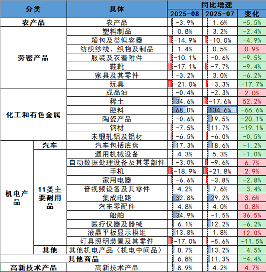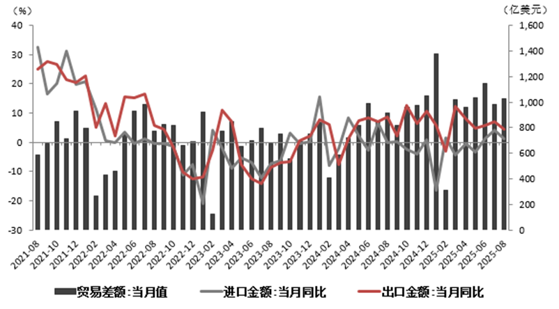 二、高税率背景下,贸易多元化特征显著。按美元计价,8月我国出口同比增长4.4%,较上月回落2.8个百分点;对美出口同比-33.1%,降幅较上月大幅扩大11.4个百分点。近日,美国总统特朗普宣布,从全球国别关税中豁免金条及石墨、钨、铀等金属产品,同时将硅酮产品纳入征税范围。尽管目前贸易关系逐步改善,但在税率近40%的水平下,我国对美出口始终承压。在出口“替代效应”下,8月我国对其余经济体出口增速均有不同程度加快,贸易多元化策略逐步显效。8月我国对东盟、欧盟出口同比分别增长22.5%、10.4%,增速较上月分别加快5.9和1.2个百分点。分产品来看,机电产品为本月主要支撑,集成电路及汽车出口同比均录得两位数。然而,8月份我国新出口订单指数和进口指数均低位运行,印证了目前贸易端需求较弱的特征,我国外贸仍面临挑战。