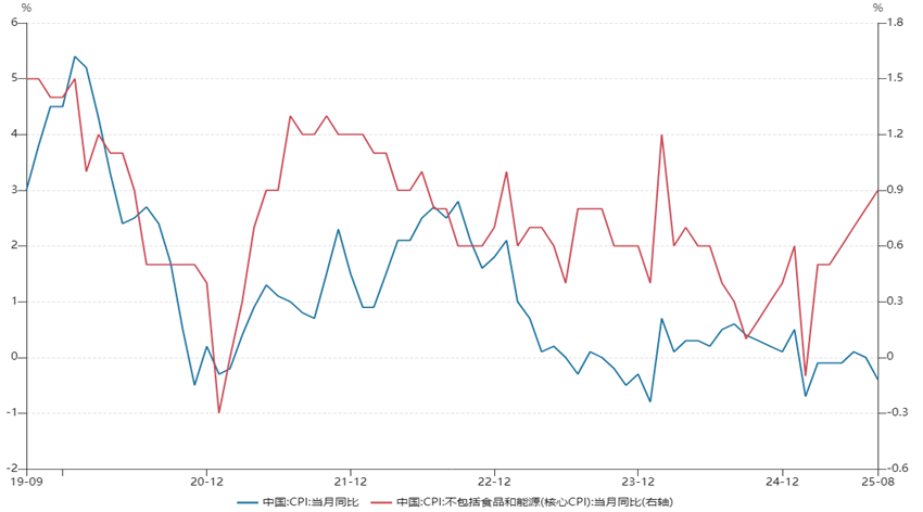 国家统计局9月10日公布的数据显示,8月CPI同比-0.4%,预期-0.2%,前值0%;环比持平。核心CPI继续回升,同比上涨0.9%,涨幅比上月扩大0.1个百分点,连续第4个月扩大。PPI同比下降2.9%,预期-2.9%,前值-3.6%,环比持平。