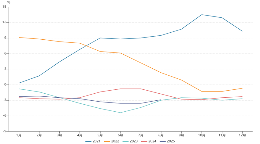 8月我国PPI同比下降2.9%,预期-2.9,前值-3.6%;环比持平,供需失衡是核心因素。虽本月PPI仍位于负增区间,但工业品价格的下行压力已有所缓和。具体来看,供需关系改善影响部分能源和原材料行业价格环比由降转涨,同时输入性因素影响国内石油和部分有色金属行业价格环比回落。其中煤炭加工价格由上月下降4.7%转为上涨9.7%,改善幅度最为显著。本月生产资料价格同比下降3.2%,生活资料价格下降1.7%,剪刀差收窄,上下游材料价格分化局势小幅好转,但不改下游企业盈利能力疲弱,与PMI小型企业景气度疲弱维持一致。