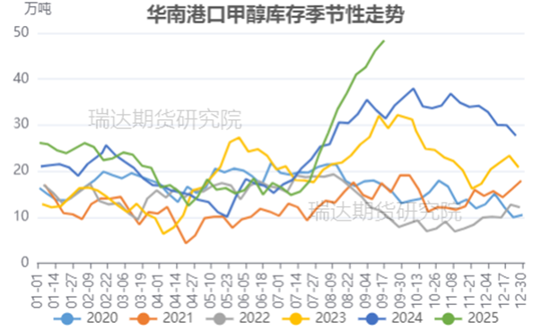 港口甲醇库存维持高位,对市场压制持续。根据船期,9月下旬显性外轮到港量仍偏高位,预计港口甲醇库存或继续累库,但具体累库幅度需关注外轮卸货速度及提货量变动。当前港口与内地市场持续分化,随着港口与内地价差扩大,套利窗口持续顺畅开启,港口低价货源通过汽运、船运等多渠道加速流向内地市场;与此同时,港口烯烃装置开车带来的需求增量,对港口高库存压力有一定的缓解作用,但是港口库存高企的核心矛盾尚未根本解决,累库格局仍在延续,10月沿海库存在十一假期结束、补库动作减弱、西南合约恢复以及部分醋酸工厂停车检修的背景下,进口表需大概率高位回落,叠加进口到港量仍将维持较高水平,港口累库趋势预计将延续。