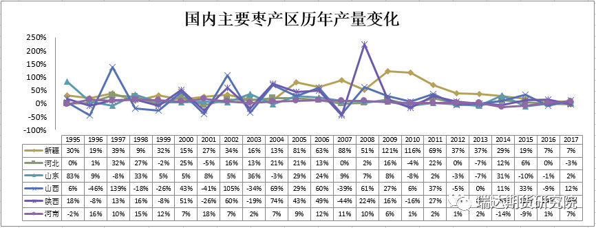 我国枣生产分布区域极广,北起内蒙古自治区、吉林,南至两广、福建、东起沿海诸省,西至云南、贵州、四川、新疆维吾尔自治区(以下简称新疆)。1995年全国就有19个省(区、市)种植红枣,当时产量排名前列的是山东、河北河南、山西和陕西,这五个省份产量占当时全国比例为89.9%,其中山东为最大生产地区,占31%。2017年,我国红枣种植区主要集中在新疆、河北、山东、山西和陕西,其中新疆红枣种植面积最大,占全国当年总产量的41.18%。