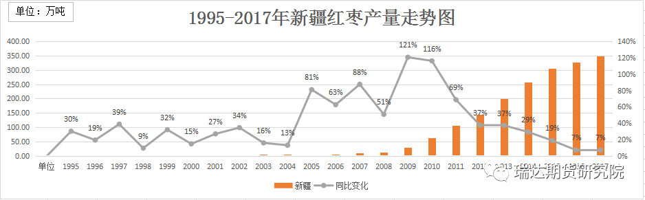 生产规模的重要指标是产量,产量对红枣价格具有最直接的影响。当红枣的产量越高时,市场红枣的供应量将越大,红枣的价格将承压下跌;当红枣的产量越低,市场供应量将越低,红枣价格将会随之上升。