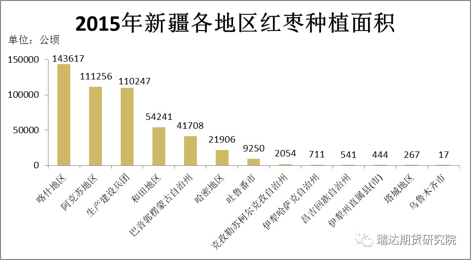 新疆红枣主要种植地分别在南疆和东疆,红枣品种比较多,据不完全统计有 17 个品种,主要品种包括灰枣、骏枣、哈密枣,其中灰枣产量最多,灰枣产地主要分别在巴音郭楞蒙古自治州、阿克苏地区、喀什地区,2015年这三个地区的红枣种植面积分别为41708公顷、111256公顷、143617公顷,分别占新疆总种植面积的8.4%、22.4%,29%,排名分别为第五、第二和第一。