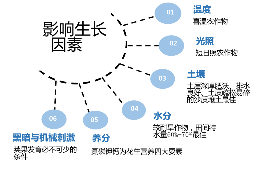 (1)温度。花生是喜温农作物,种子发芽的最低温度为12~15℃,最适温度为25~37℃。开花期以23~28℃为宜,果针伸长以25~30℃为宜。荚果发育以结果层土温15~33℃为宜。(2)光照。花生为短日照农作物,多数品种对日照长度反应不敏感,光照的强弱对花生生长发育影响较大,充足的光照是保证花早、花多的重要条件。(3)土壤。花生是忌连作农作物,花生应与禾谷类或薯类农作物轮作,不宜与豆科农作物轮作,轮作期3年以上为宜。高产花生适宜的土壤条件是:土层深厚肥沃、排水良好、疏松易碎的沙质壤土。(4)水分。花生是较耐旱作物。播种时最适宜土壤含水量为田间持水量的60%~70%。开花下针到结荚阶段,是花生一生需水量多、对水分敏感的时期,以土壤含水量为田间持水量的60%~70%为宜。(5)养分。花生在整个生长发育过程中,需要吸收氮、磷、钾、钙、镁、硫等大量元素和铁、钼、硼等微量元素。在这些营养元素中,以氮、磷、钾、钙4种元素需求量较大,称为花生营养的四大要素。花生是喜钙农作物,需钙量远多于一般禾谷类农作物。钙能促进荚果发育,提高饱果率。钼是根瘤中固氮酶的主要成分,能提高根瘤固氮能力。硼可刺激花粉的萌发和花粉管的伸长,有利于受精结实。(6)黑暗与机械刺激。黑暗和机械刺激是荚果发育不可少的条件。果针不入土,则无论怎样伸长,子房始终不能膨大结实。果针入土后,不仅进入了黑暗环境,而且受到了土的机械刺激作用。