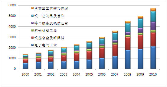 世界白银实物消费主要来自工业制造领域、摄影业、珠宝首饰、银器和铸币印章(此处统计不含金融投资衍生白银需求)。传统白银消费领域摄影业因数码技术的发展对白银的需求呈下降趋势,但仍占有一定比重;工业领域和珠宝首饰业对白银的消费在经济增长的带动下总体呈现增长态势,工业需求受经济波动周期影响较大。